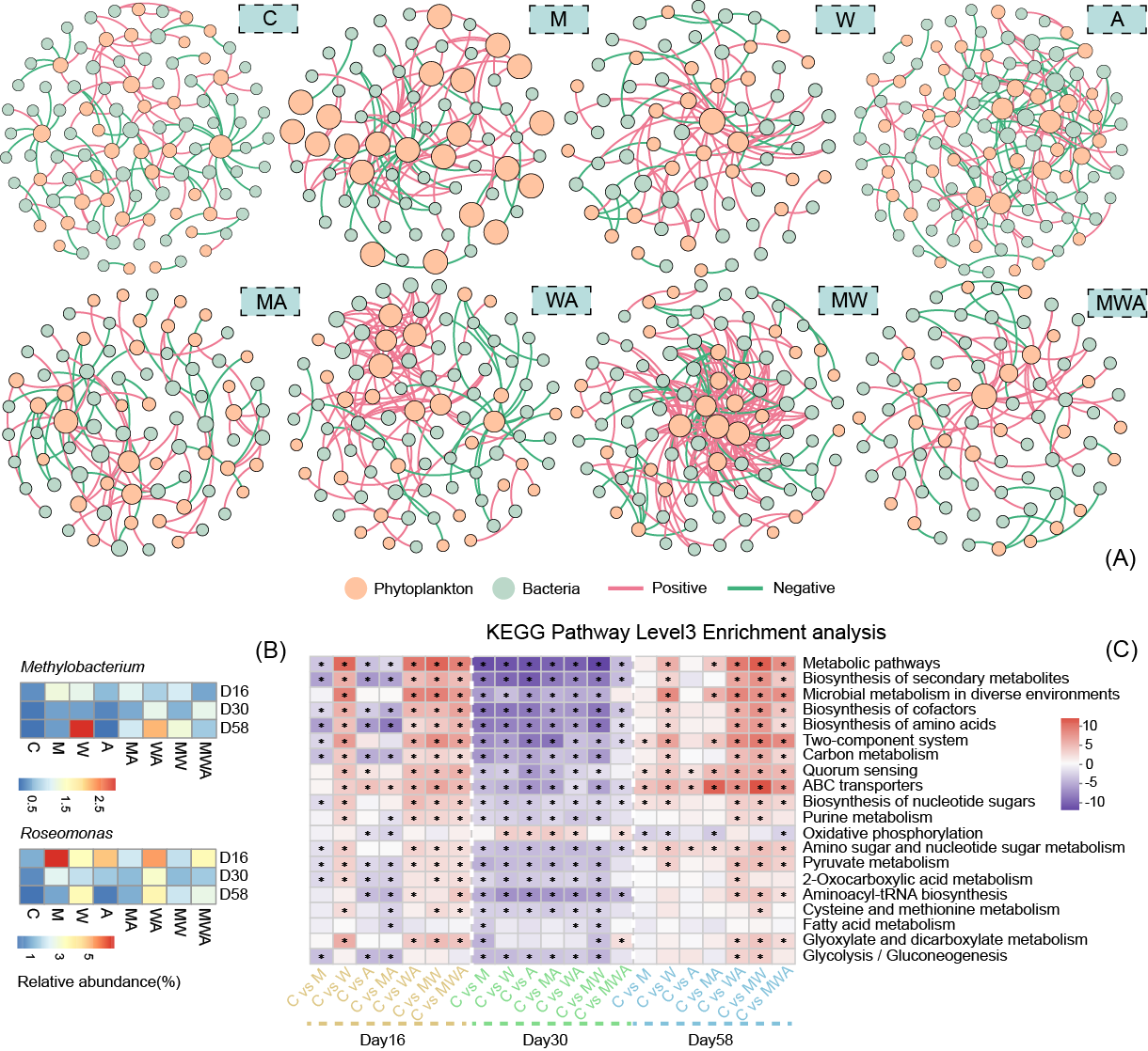 图2 不同处理下藻-菌互作网络图(A);关键ARGs宿主菌丰度热图(B);藻际细菌KEGG代谢通路富集分析(C)